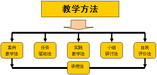 案例教学法、任务驱动法、实践教学法、小组研讨法、自我评价法、讲授法