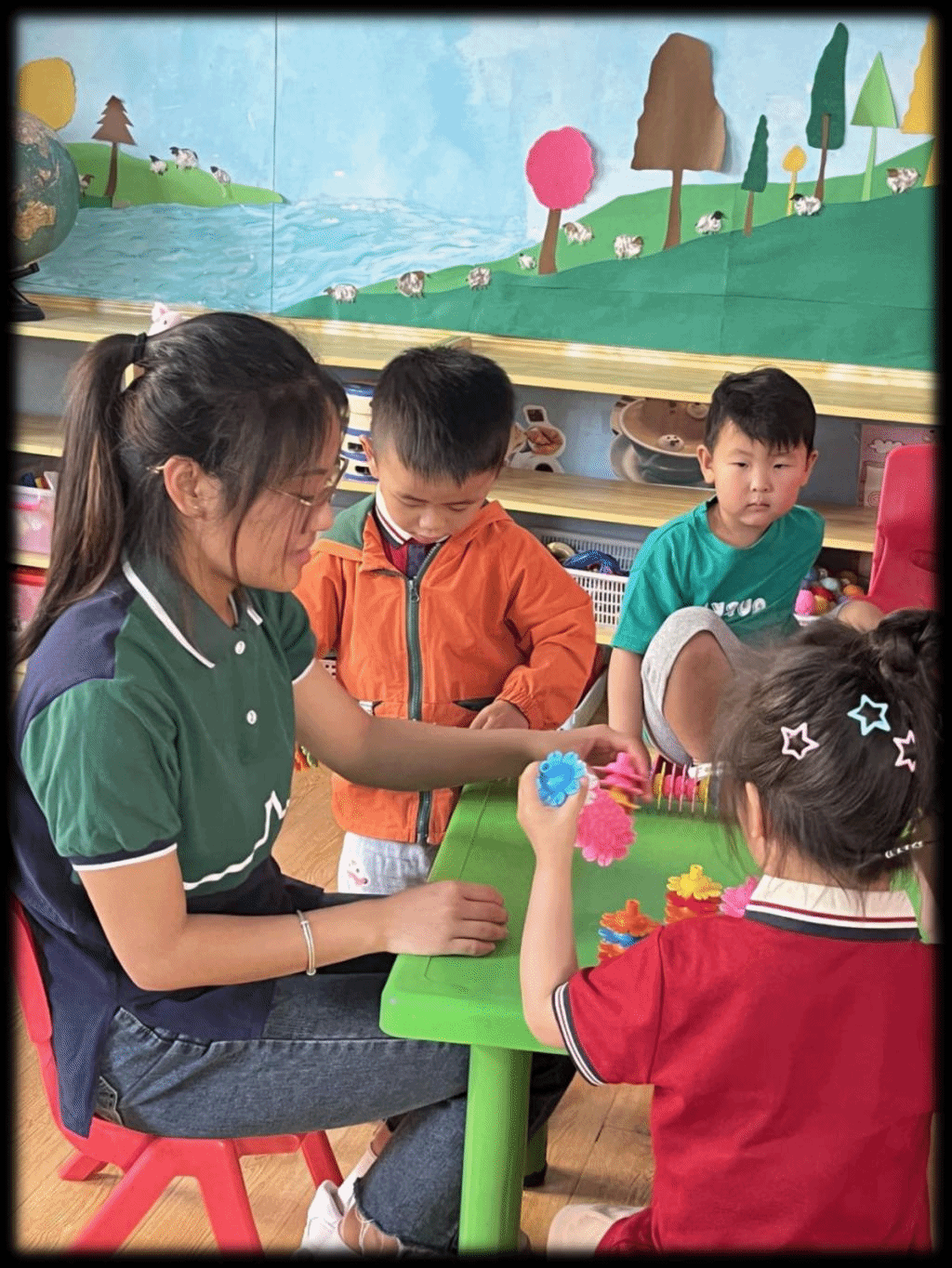 在工作中富有责任心,工作积极主动,认真完成工作任务,在工作中遇到难题也会及时请教前辈认真学习,克服困难,不断总结,提升自己,责任心强,积极配合老师开展各种线上工作,线下工作,做到上传下达,对于学校分配的各种活动,积极开展并圆满完成。在幼儿园组织蒙台梭利感官教育活动中,积极主动完成分配任务,在以自主游戏为活动中心的过程中,启发幼儿排列组合的发展。以下是我在活动中引导幼儿的图片: