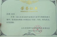 6.2014年4月,指导学生参加第二届山东省高校学前教育专业学生舞蹈技能大赛,舞蹈《中国芭比》获二等奖