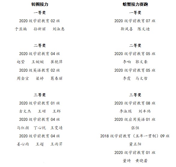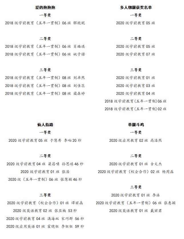 运动会共分为:多人绑腿跑、爱的抱抱抱、仙人指路、螃蟹接力赛跑、转圈接力、单腿斗鸡六个项目,这些项目也都是为了考验同学们的团队合作精神设立的。