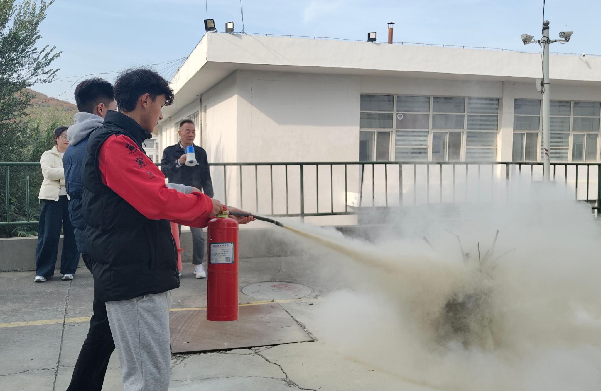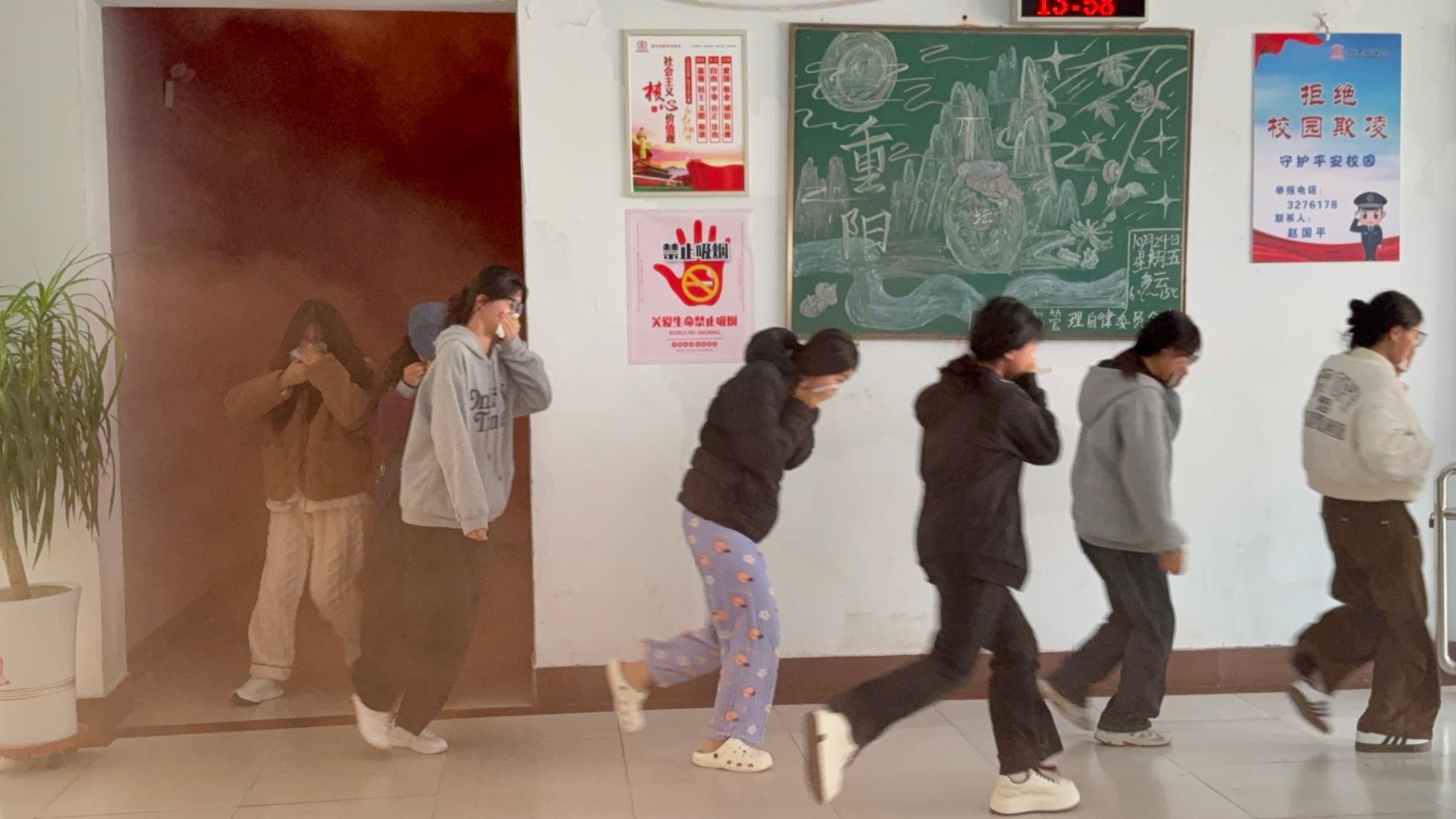 演练模拟4号公寓突发火灾,现场烟雾弥漫。宿管迅速拉响警报,各楼层引导员有序组织学生沿预定路线撤离。学生们用湿毛巾捂住口鼻,弯腰低姿快速疏散,全程未出现推挤踩踏。室外灭火环节中,张中升现场示范灭火器"提、拔、握、压"四字操作法,强调上风站位与安全距离。在专业指导下,师生分组进行灭火实操,通过亲手操作消防栓、灭火器等设备,掌握初期火灾扑救技能。