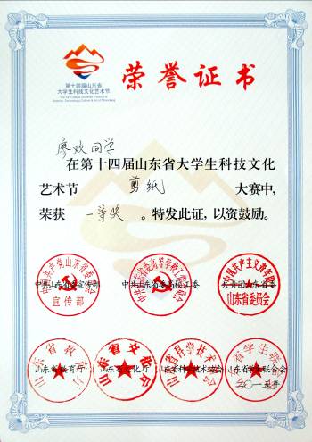近日,由省委宣传部、省委高校工委、团省委、教育厅、文化厅、省科协和省学联主办的第十四届山东省大学生科技文化艺术节剪纸大赛落下帷幕。大赛以“弘扬优秀传统文化,践行社会主义核心价值观” 为主题,面向全省大学生征集作品,在48所高校推荐的673件作品中,我院参赛同学凭借优秀的技能获得了评委和专家的认可,共获得了1个一等奖,5个二等奖,3个三等奖。