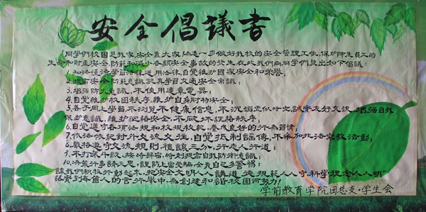百善文明为先,万思安全最重。学前教育学院将在上级有关部门领导的指导下,把安全工作始终摆在各项工作的首位,继续加强安全知识教育,提高学生自我防护能力,争创“和谐平安校园”,把安全工作切实落到实处。
