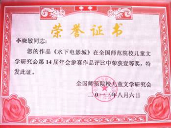 第14届年会还采取以文会友的方式,进行了儿童文学论文、创作评奖、表情朗读等活动。我院师生第一次参会即获佳绩。2011级学前教育专业14班李晓敏等同学创编的《水下电影院》等9篇作品获得一等奖、2012级学前教育专业9班车洪丽等同学创编的《小笨象》等10篇作品获得10项二等奖、2012级学前教育专业13班孙洁等同学创编的《小老鼠阿糊》等27篇作品等获得三等奖;隋立国老师撰写的论文《学前教育专业学生儿童文学素养的构建研究》获得一等奖并在年会上作典型发言。