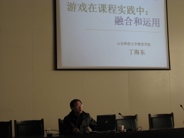 丁海东教授是中国学前教育研究会理事会理事、中国学前教育研究会学术委员会学术委员、山东省学前教育专业委员会常务理事、教育学博士、山东师范大学学前教育学硕士学位点负责人,“学前课程与游戏”研究方向带头人,《学前教育研究》杂志编委。此次报告会丁海东教授以“游戏在课程实践中:融合与运用”为题,从“游戏作为课程实践的基本手段”、“游戏作为课程实践的基本内容”、“游戏作为一种精神的存在”三个方面为大家阐述了游戏在幼儿园课程实践中的价值、意义、实施等学术问题,将游戏这种特殊的实践活动在学前教育中的神奇作用展现给大家。报告中,丁教授风趣幽默,深入浅出的教学风格给师生们留下了深刻印象,整场报告会气氛轻松、活泼、令人愉悦。