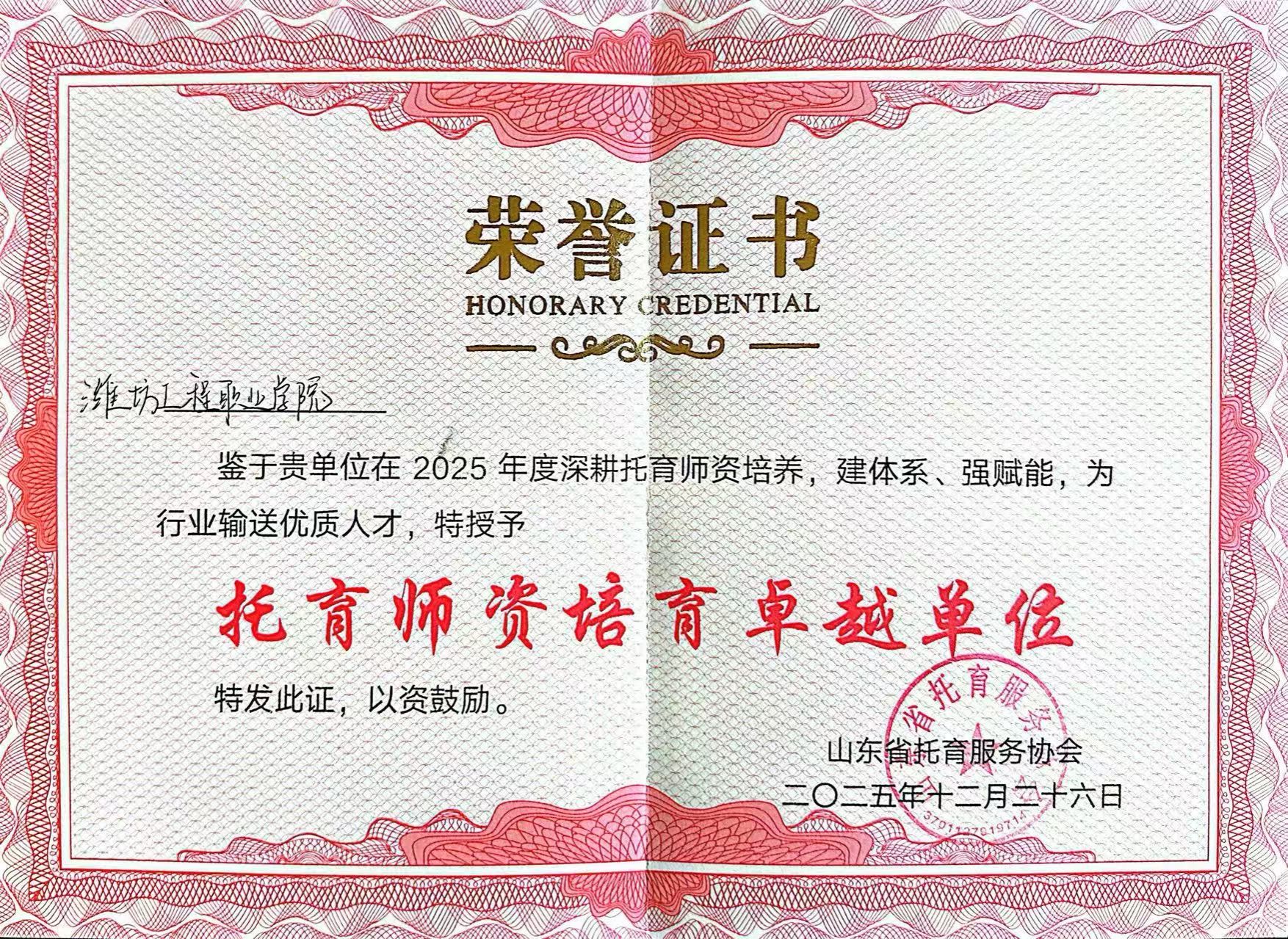 近日,山东省托育服务协会2025年年会暨第四期托育服务高质量发展培训班在山东隆重举行。作为我省托育服务领域的一次年度盛会,本次活动汇聚了行业领导、专家学者及全省顶尖托育机构代表,共同擘画托育服务高质量发展的新蓝图。会上,我院凭借在托育人才培养领域的卓越贡献和突出成果,被授予“托育师资培育卓越单位”荣誉称号,彰显了行业对我院工作的充分肯定。